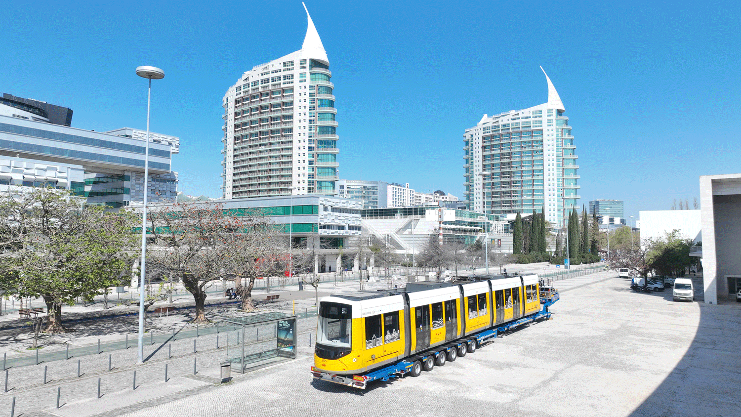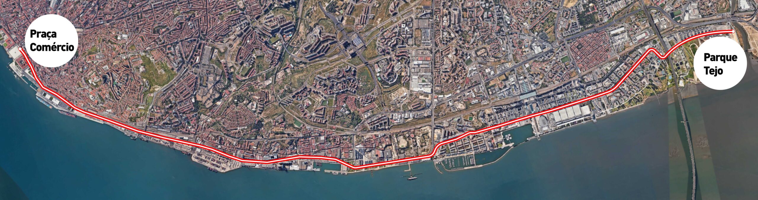 Imagem representativa do traçado da linha 16E, entre a Praça do Comércio e o Parque Tejo.